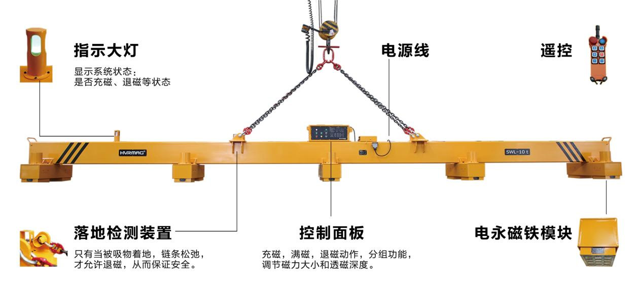 作為店內(nèi)的人氣產(chǎn)品,電永磁吊具可謂做工精湛,一臺(tái)完整的悍威磁電電永磁吊具由指示燈、落地檢測(cè)裝置、控制面板、電永磁鐵模塊、橫梁、電源線、遙控器這幾個(gè)部分構(gòu)成,每一部分都承載著相應(yīng)重要的功能,以供操作人員在實(shí)際應(yīng)用中更省心、更舒心。