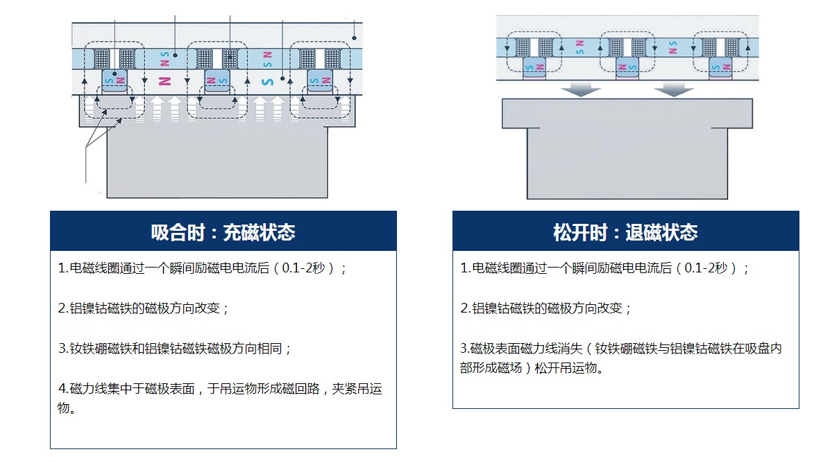 而電永磁鐵則是通過(guò)控制器進(jìn)行充磁、退磁,且只有在充磁和退磁的瞬間消耗電能,工作中無(wú)需耗電,節(jié)約95%以上的電能,大大控制了工作成本。