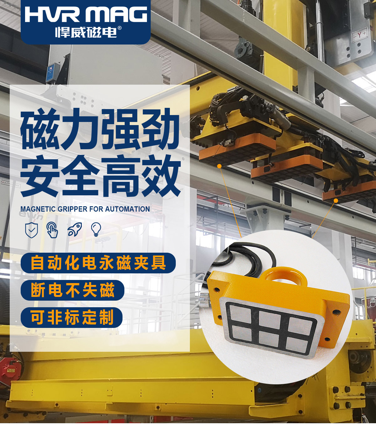 電永磁鐵可以用作桁架機(jī)器人上集成的磁力抓手,以拾取,提升,裝載,放置,搬運(yùn)用于自動(dòng)化生產(chǎn)線的鋼鐵材質(zhì)工件,作為手臂的末端工具。磁力抓手既減少了時(shí)間,又減少了使流程自動(dòng)化并確保流程順利進(jìn)行所需的操作數(shù)。電永磁夾具的尺寸/形狀/抓力可根據(jù)客戶要求定制。